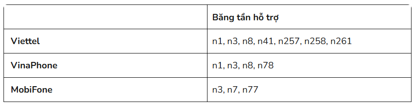 Bước 2: Đối chiếu với bảng liệt kê băng tần 5G của các nhà mạng bên dưới. Nếu có ít nhất một băng tần trùng khớp thì thiết bị sẽ hỗ trợ 5G với nhà mạng đó.