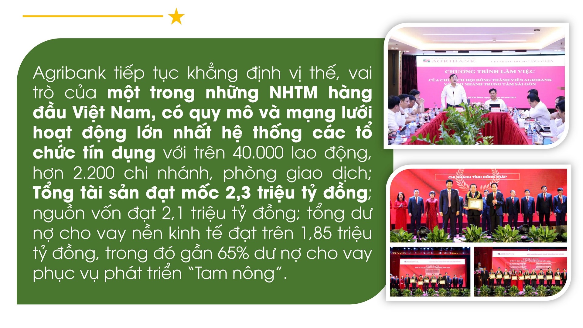 Agribank tiếp tục khẳng định vị thế, vai trò của một trong những NHTM hàng đầu Việt Nam, có quy mô và mạng lưới hoạt động lớn nhất hệ thống các tổ chức tín dụng với trên 40.000 lao động, hơn 2.200 chi nhánh, phòng giao dịch; Tổng tài sản đạt mốc 2,3 triệu tỷ đồng; nguồn vốn đạt 2,1 triệu tỷ đồng; tổng dư nợ cho vay nền kinh tế đạt trên 1,85 triệu tỷ đồng, trong đó gần 65% dư nợ cho vay phục vụ phát triển “Tam nông”; các tỷ lệ an toàn hoạt động bảo đảm quy định; Agribank đứng trong TOP 10 doanh nghiệp nộp thuế lớn nhất cho nhà nước.