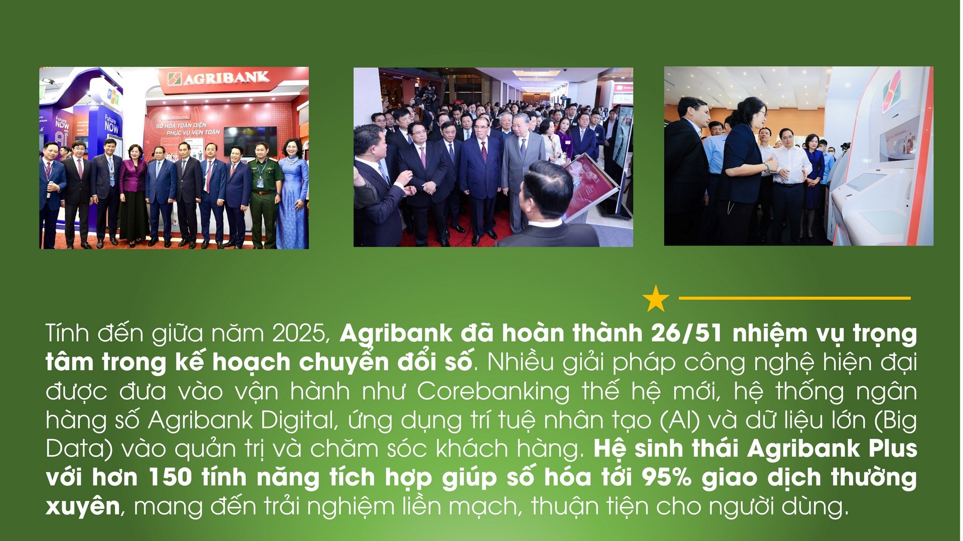 Với các giải pháp đột phá, đồng bộ, quyết liệt, tính đến giữa năm 2025, Agribank đã hoàn thành 26/51 nhiệm vụ trọng tâm trong kế hoạch chuyển đổi số. Nhiều giải pháp công nghệ hiện đại được đưa vào vận hành như Corebanking thế hệ mới, hệ thống ngân hàng số Agribank Digital, ứng dụng trí tuệ nhân tạo (AI) và dữ liệu lớn (Big Data) vào quản trị và chăm sóc khách hàng. Hệ sinh thái Agribank Plus với hơn 150 tính năng tích hợp giúp số hóa tới 95% giao dịch thường xuyên, mang đến trải nghiệm liền mạch, thuận tiện cho người dùng.