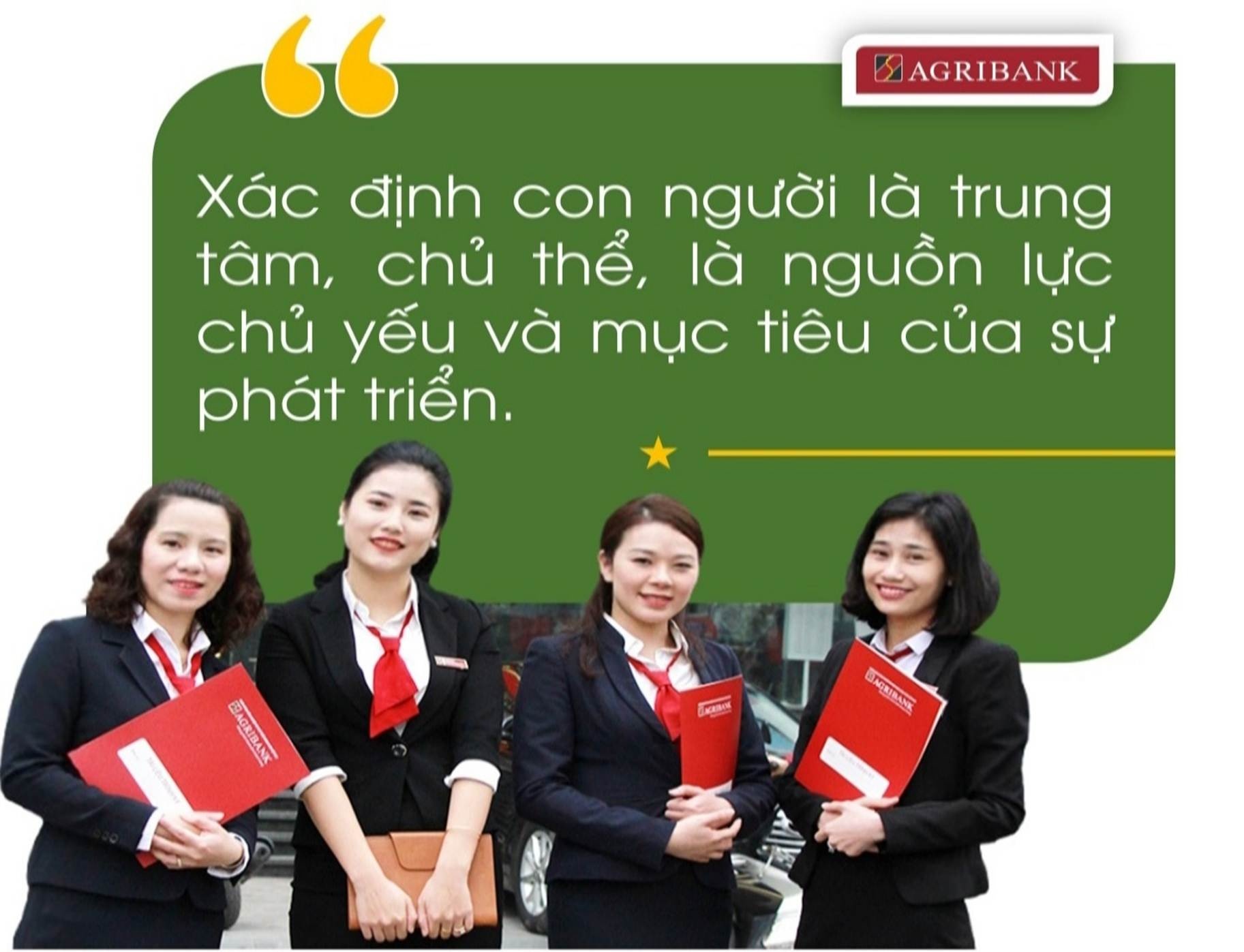 Xác định con người là trung tâm, chủ thể, là nguồn lực chủ yếu và mục tiêu của sự phát triển, Agribank đã tập trung chăm lo, xây dựng con người phát triển toàn diện, trọng tâm là việc đổi mới công tác giáo dục, đào tạo, nâng cao chất lượng nguồn nhân lực, sắp xếp, sử dụng có hiệu quả nguồn nhân lực; thường xuyên rà soát, đánh giá, xây dựng đội ngũ cán bộ lãnh đạo, quản lý các cấp, nhất là lãnh đạo chủ chốt tại Trụ sở chính và các chi nhánh đáp ứng yêu cầu, nhiệm vụ kinh doanh trong tình hình mới; xây dựng cơ chế tiền lương, thi đua khen thưởng công khai khuyến khích người lao động theo hướng làm nhiều, hưởng nhiều, khuyến khích đối với lao động trong lĩnh vực công nghệ thông tin từ đó tạo động lực cho người lao động hăng say cống hiến, tăng năng suất lao động rõ rệt, thu nhập người lao động được cải thiện góp phần ổn định tư tưởng, củng cố niềm tin vào sự nghiệp đổi mới của Đảng và Agribank.