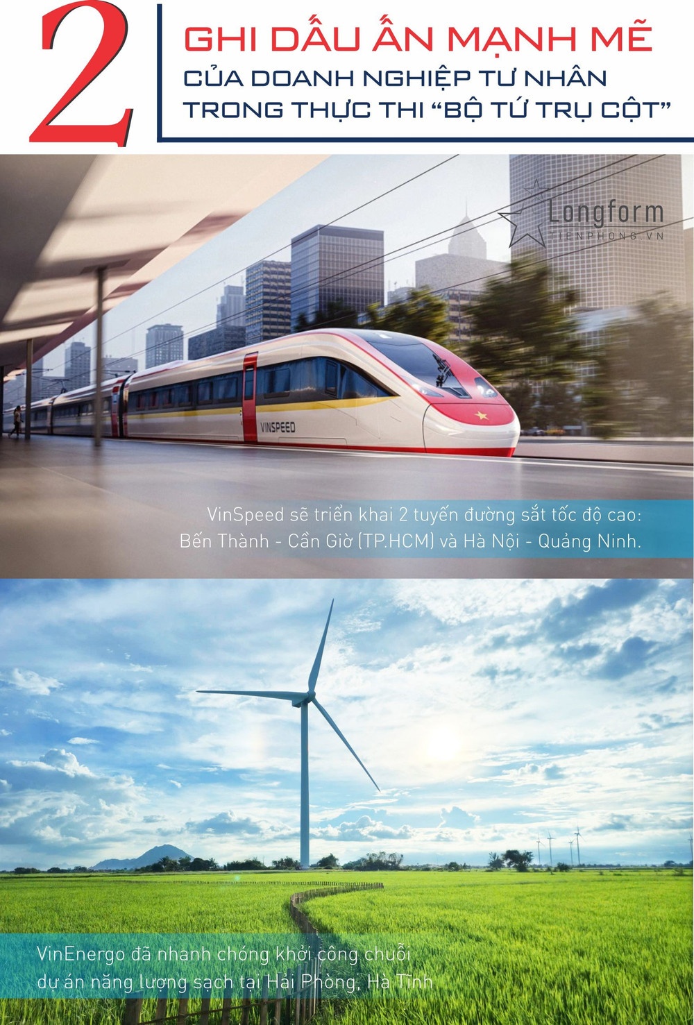 Ở lĩnh vực hạ tầng, VinSpeed sẽ triển khai 2 tuyến đường sắt tốc độ cao, gồm: Bến Thành - Cần Giờ (TP.HCM) và Hà Nội - Quảng Ninh. Trong khi đó, VinEnergo đã nhanh chóng khởi công chuỗi dự án năng lượng sạch tại Hải Phòng, Hà Tĩnh, góp phần thúc đẩy chuyển dịch năng lượng và hiện thực hóa mục tiêu Net Zero vào năm 2050.