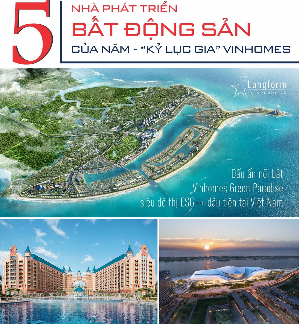 Dấu ấn nổi bật là Vinhomes Green Paradise (Cần Giờ, TP.HCM) - siêu đô thị ESG++ đầu tiên tại Việt Nam, ứng viên chính thức đầu tiên của bình chọn toàn cầu “7 Kỳ quan Đô thị Tương lai”; cùng Khu đô thị thể thao Olympic (Hà Nội) với quy mô hơn 9.171 ha, tổng vốn đầu tư 925.000 tỷ đồng - siêu đô thị lớn nhất Việt Nam từ trước đến nay.