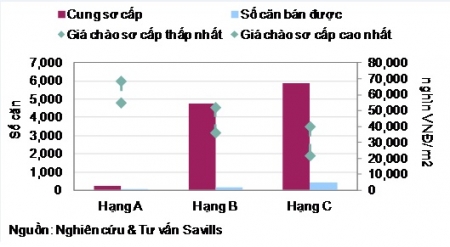 Theo Nghiên cứu của Savills Việt Nam, đối với thị trường căn hộ để bán, hiện tổng nguồn cung sơ cấp đạt khoảng 10.900 căn, giảm 9% so với quý II/2012. Giá chào bán sơ cấp dao động từ 16 triệu đồng/m2 đến 68 triệu đồng/m2. Tuy nhiên tỷ lệ hấp thụ trung bình lại giảm 9%. Trong khi đó, giá chào bán thứ cấp trung bình giảm ở hầu hết các quận. Trong đó, Tây Hồ giảm mạnh nhất với tỷ lệ 9%, Cầu Giấy là 6%... Sự thay đổi trong giá chào bán thứ cấp phụ thuộc vào một số yếu tố như vị trí, mức độ phát triển cơ sở hạ tầng, tình trạng xây dựng và giá chào bán các dự án.