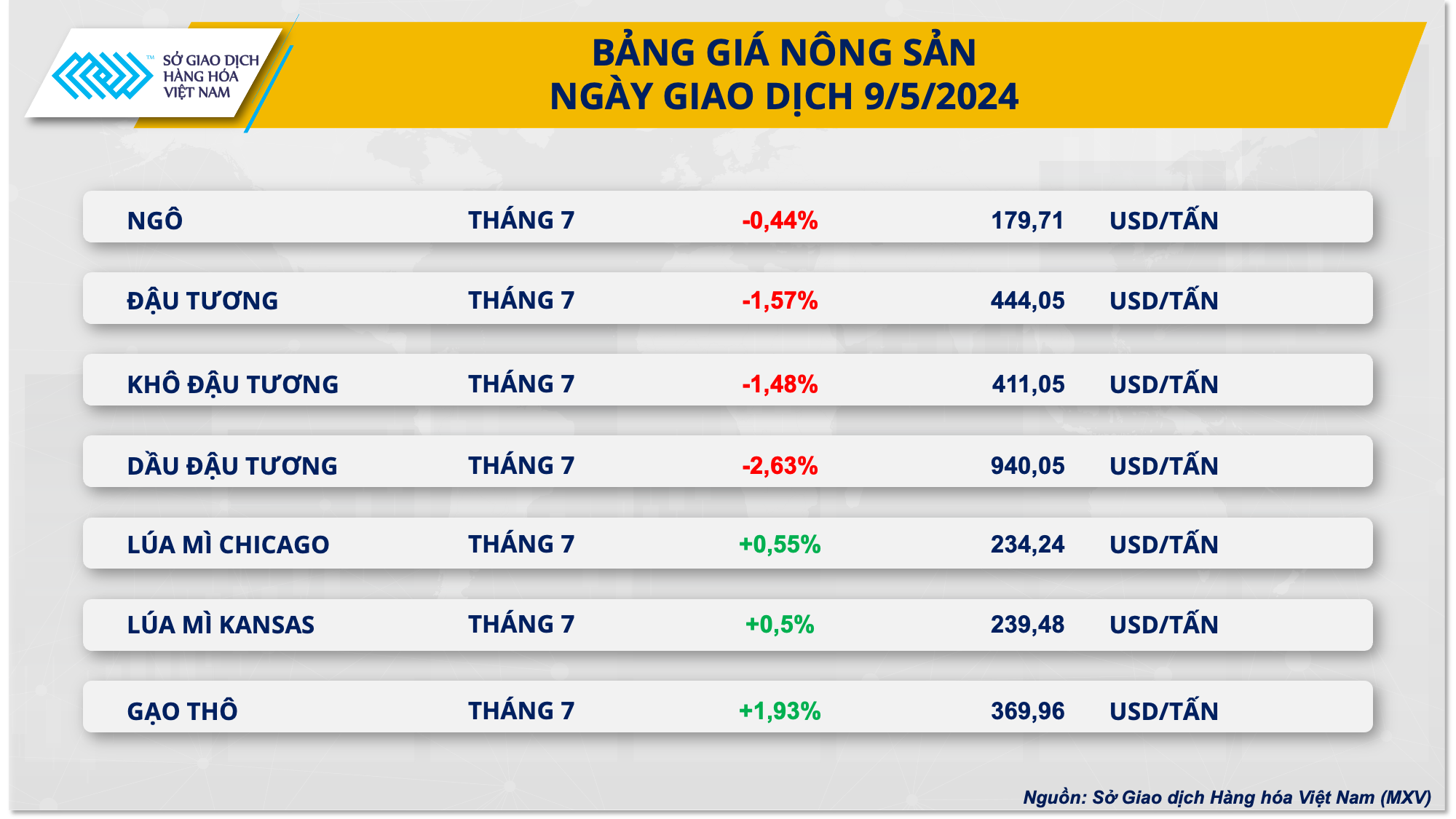 Trên thị trường nông sản, nhóm đậu tương dẫn dắt đà suy yếu. Mặt hàng này tiếp tục mở rộng đà sụt giảm trong ngày giao dịch 9/5 với mức giảm 1,57%, đánh dấu ngày thứ 3 liên tiếp đóng cửa trong sắc đỏ. Triển vọng nhu cầu quốc tế đối với nguồn cung từ Mỹ đang dần chững lại, kết hợp với sự quay trở lại của những tín hiệu tích cực về nguồn cung Nam Mỹ là yếu tố đã thúc đẩy lực bán trên thị trường.