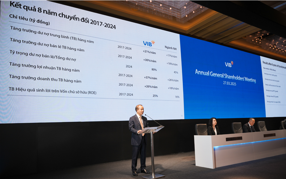 Theo báo cáo của HĐQT tại ĐHĐCĐ, sau 8 năm của hành trình chuyển đổi chiến lược 10 năm (2017-2026), VIB đã thiết lập được một nền tảng vững chắc cho sự tăng trưởng vượt trội về quy mô, chất lượng và giá trị thương hiệu, đưa Ngân hàng vào nhóm đầu ngành về hiệu quả kinh doanh, tăng trưởng quy mô tài sản và doanh thu, quản trị chi phí hiệu quả, kiểm soát rủi ro chặt chẽ.
