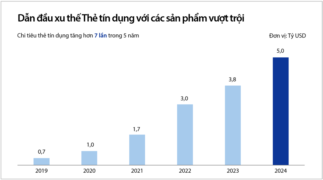 | Tăng trưởng chi tiêu thẻ từ 2019-2024. Nguồn: Tài liệu ĐHĐCĐ thường niên 2025 |