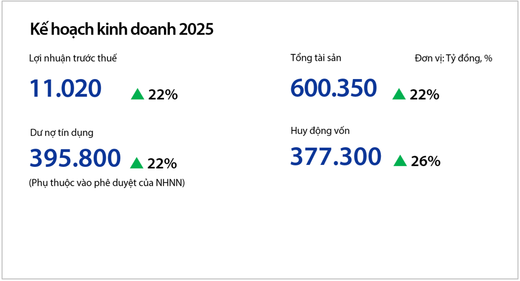 Đáng chú ý, ĐHĐCĐ đã thông qua kế hoạch kinh doanh năm 2025 do HĐQT đề xuất, bao gồm tăng trưởng tổng tài sản, dư nợ, huy động vốn và lợi nhuận. Trong đó, mức tăng trưởng dư nợ tín dụng có thể được điều chỉnh tùy thuộc vào hạn mức cho phép của NHNN.