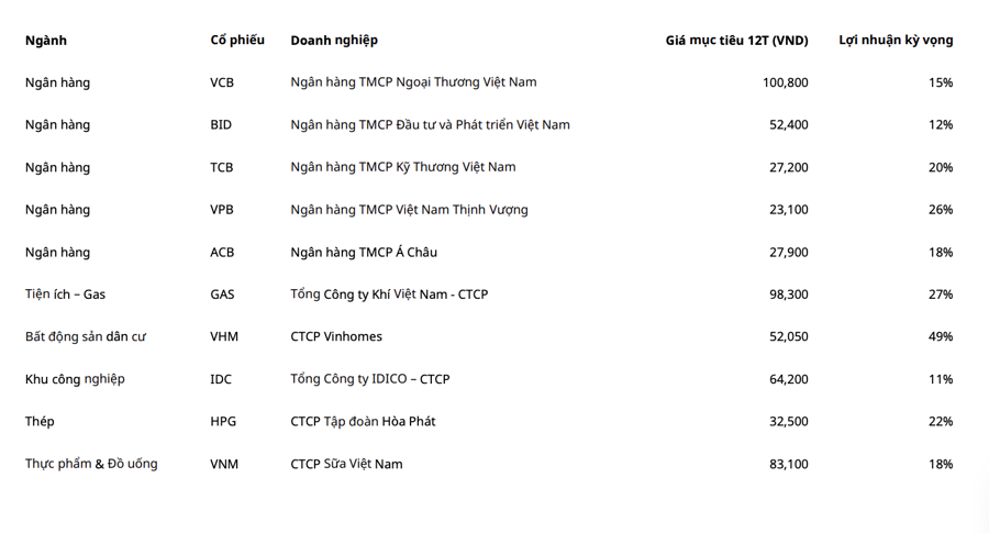 Trên nhận định đó, Mirae Asset đưa ra khuyến nghị 10 cổ phiếu cho tháng 8 trong đó có đến một nửa là cổ phiếu ngân hàng với tiềm năng tăng giá lên tới 26%.