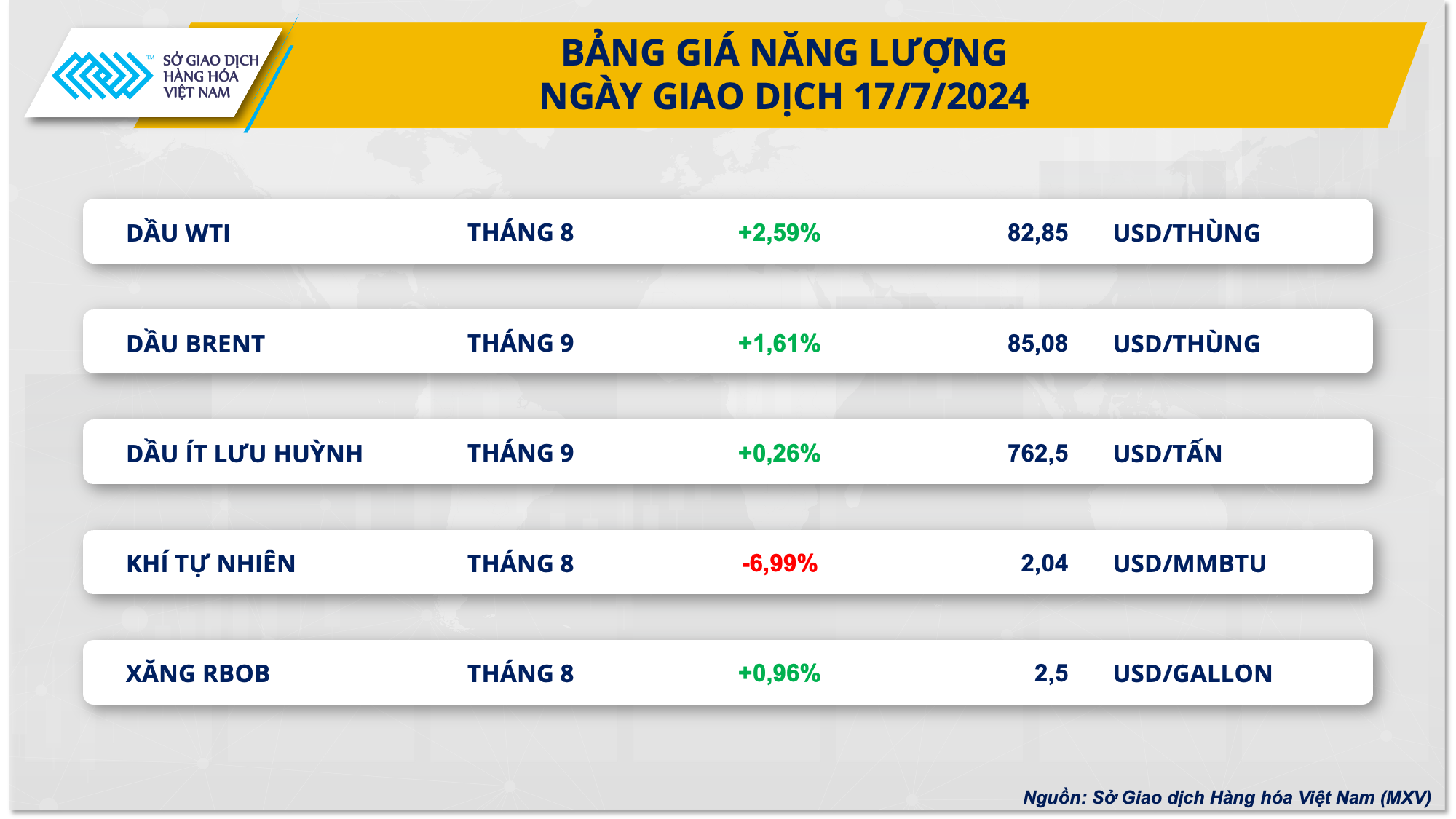 Đi ngược với xu hướng của thị trường kim loại trong ngày giao dịch hôm qua, giá dầu thế giới cắt đứt chuỗi suy yếu ba phiên liên tiếp khi bật tăng trước rủi ro nguồn cung bên cạnh sức ép tồn kho từ Mỹ. Kết phiên, giá dầu WTI tăng 2,59% lên mức 82,85 USD/thùng, dầu thô Brent tăng 1,61%, đạt mức 85,08 USD/thùng.