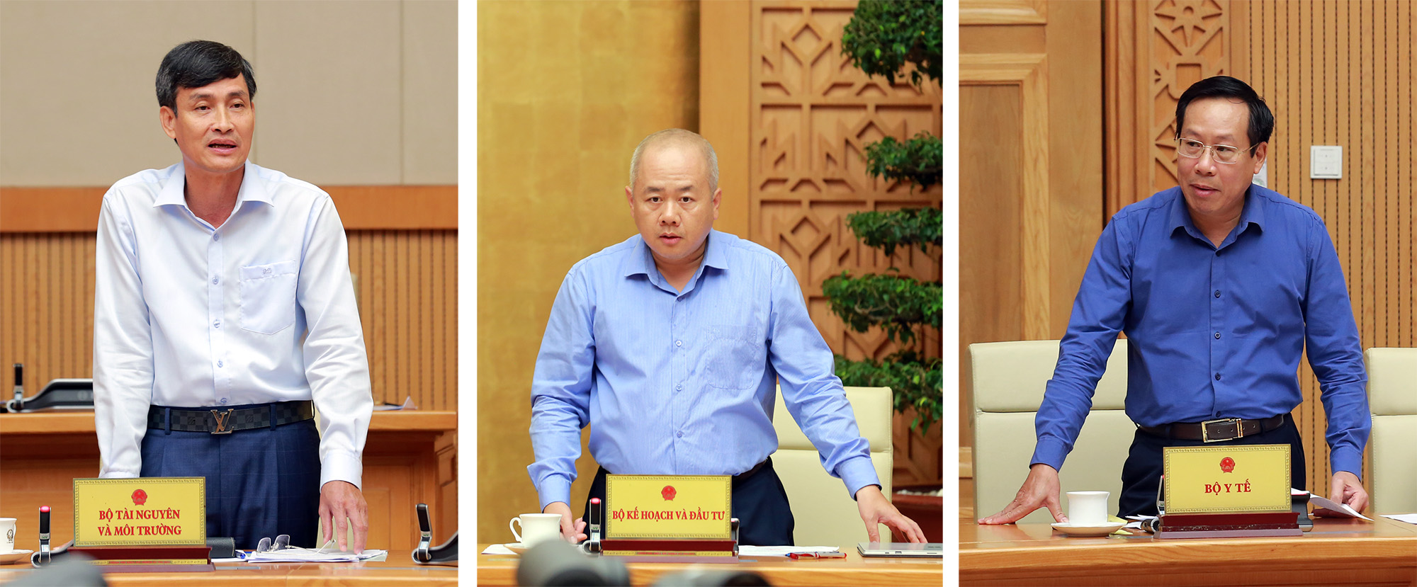 | Lãnh đạo các bộ TN&MT, KH&ĐT, Y tế (từ trái qua phải) phát biểu tại cuộc họp - Ảnh: VGP/Minh Khôi |