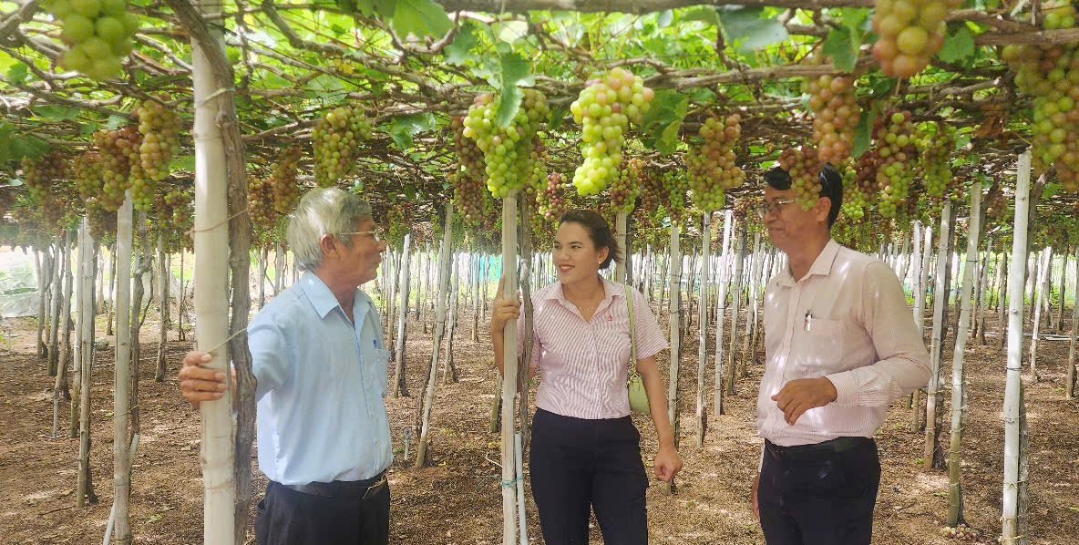 | Du khách tham quan mô hình vườn nho kết hợp làm du lịch ở Ninh Hải. |