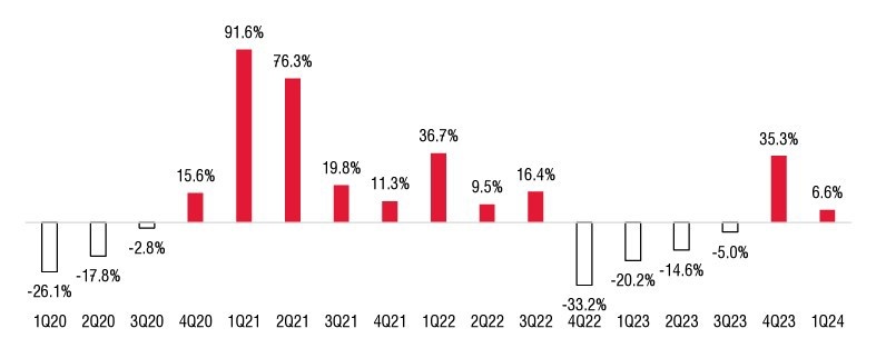 Kỳ vọng trên đang khớp với thực tế. Thống kê từ SSI Research cho biết, trong quý I/2024 tổng lợi nhuận sau thuế của doanh nghiệp niêm yết trên thị trường (1.059 doanh nghiệp) tăng 6,6% so với cùng kỳ và tăng 3,4% so với quý trước đó, ghi nhận mức lợi nhuận cao nhất trong vòng 7 quý (chỉ thấp hơn hai quý đầu năm 2022). “Sau giai đoạn biến động mạnh kể từ dịch Covid-19, lợi nhuận đang đi vào giai đoạn phục hồi, tăng trưởng ổn định hơn nhưng có sự phân hóa”, SSI Research cho biết.