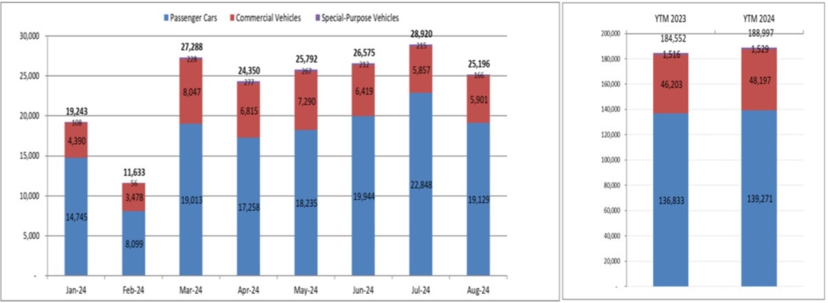 Trong số xe được bán ra trong tháng 8 có 19.129 du lịch; 5.901 xe thương mại và 166 xe chuyên dụng. Như vậy, doanh số xe du lịch giảm 16%; xe thương mại tăng nhẹ 1% và xe chuyên dụng giảm 23% so với tháng trước.