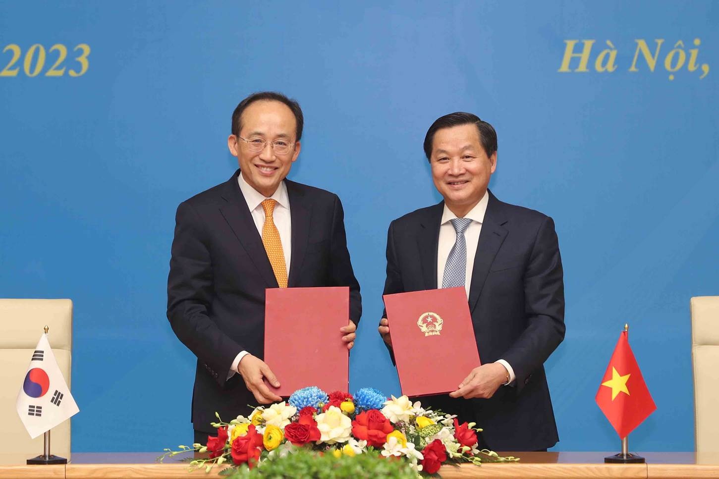 Trong đó, hai bên đã thống nhất cùng phối hợp để tăng cường hợp tác thương mại giữa hai nước, trong đó có các giải pháp nhằm giảm nhập siêu của Việt Nam từ Hàn Quốc, đẩy mạnh xúc tiến hơn nữa việc xuất khẩu một số mặt hàng sang nhau trên cơ sở Hiệp định Thương mại tự do Việt - Hàn, hướng tới mục tiêu kim ngạch thương mại giữa hai nước đạt 100 tỷ đôla Mỹ năm 2023 và 150 tỷ đôla Mỹ năm 2030.