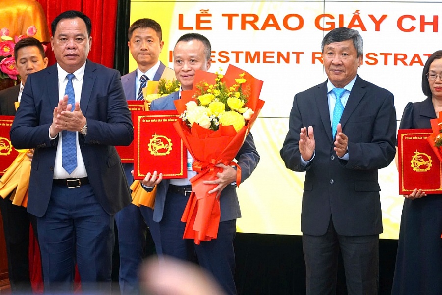 | Ông Hồ Thanh Sơn, Phó Bí thư thường trực Tỉnh ủy Tỉnh Đồng Nai và ông Võ Tấn Đức, chủ tịch UBND Tỉnh Đồng Nai trao giấy chứng nhận đầu tư cho các doanh nghiệp FDI |