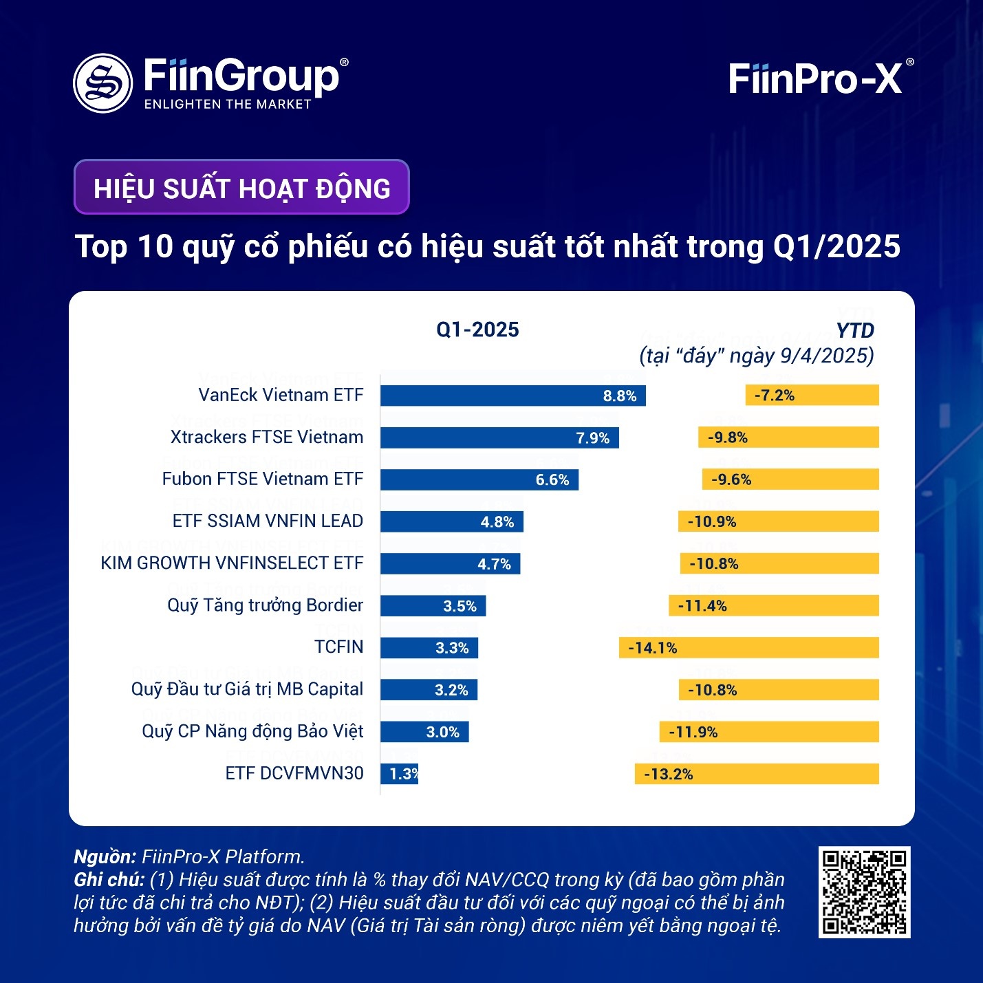 Bức tranh dòng tiền quý I/2025 phản ánh rõ tâm lý phòng thủ của nhà đầu tư tổ chức, trong bối cảnh thị trường chịu ảnh hưởng nặng nề từ các yếu tố bất định bên ngoài, đặc biệt là thông tin về kế hoạch áp thuế đối ứng từ Mỹ đối với hàng hóa nhập khẩu Việt Nam lên tới 46%. Chính yếu tố này đã kích hoạt đợt điều chỉnh mạnh trên thị trường, khiến VNINDEX giảm tới 16,9% chỉ trong hai tuần đầu tháng 4 và “thổi bay” thành quả của hầu hết các quỹ. Mặc dù chỉ số đã hồi phục ấn tượng +12,2% sau đó, tâm lý chung của nhà đầu tư vẫn thiên về sự thận trọng.