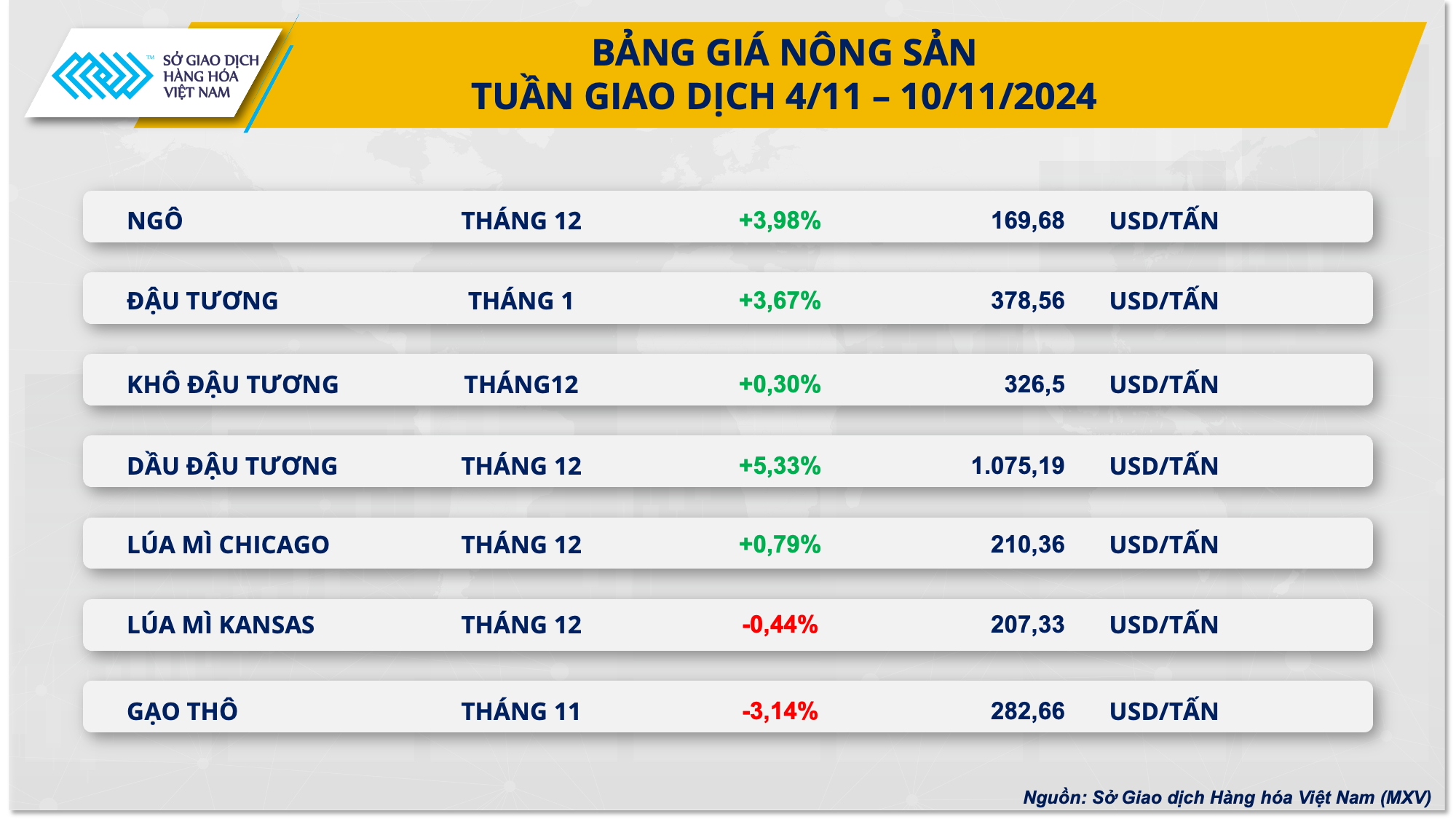 Giá cà phê Robusta tăng 2,27%, chấm dứt chuỗi giảm 5 tuần liên tiếp; giá cà phê Arabica quay đầu tăng 4,28% sau hai tuần giảm liên tiếp trước đó. Đồng USD mạnh lên sau cuộc bầu cử Mỹ giúp lực mua trở bên áp đảo, bất chấp số liệu xuất khẩu tích cực từ các quốc gia sản xuất cà phê hàng đầu thế giới.