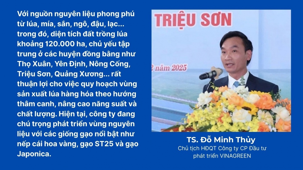 Theo ông Cao Trọng Hưng - Giám đốc Công ty VinaGreen, chiến lược cốt lõi hiện nay của công ty là phát triển vùng nguyên liệu gắn với các giống gạo đặc sản có tiềm năng xuất khẩu như: nếp cái hoa vàng, gạo ST25, gạo Japonica. Các vùng nguyên liệu được quy hoạch bài bản tại các huyện đồng bằng của tỉnh Thanh Hóa như: Thọ Xuân, Yên Định, Nông Cống, Triệu Sơn… kết hợp với các vùng liên kết tại miền Tây Nam Bộ như: Kiên Giang, Sóc Trăng, An Giang và Tây Nguyên như Đắk Lắk, Gia Lai, hình thành nên mạng lưới sản xuất theo chuỗi khép kín.