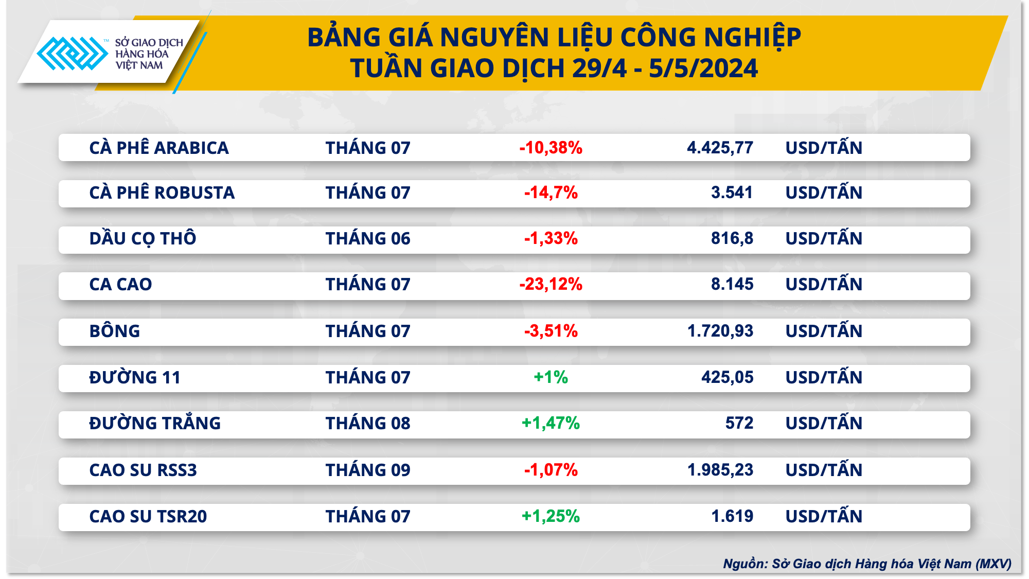 19 trên tổng số 31 mặt hàng sụt giảm, trong đó nhiều mặt hàng đồng loạt lao dốc kéo chỉ số MXV-Index chốt tuần (29/4 - 3/5) giảm sâu 2,95% xuống 2.265 điểm. Tuy nhiên, nhờ tính chất giao dịch hai chiều, dòng tiền đầu tư đến thị trường vẫn được duy trì ổn định. Giá trị giao dịch toàn Sở trung bình đạt trên 5.700 tỷ đồng mỗi ngày.