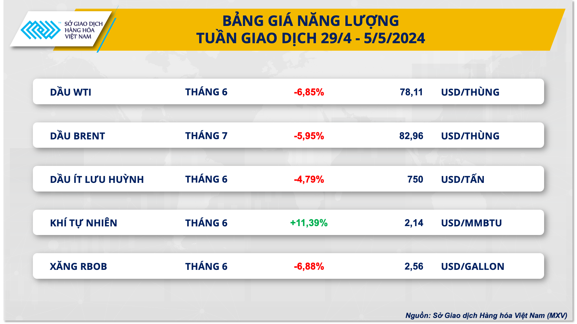 Kết thúc tuần giao dịch 29/4 - 3/5, giá dầu ghi nhận tuần giảm giá mạnh nhất kể từ cuối tháng 1 do sức ép vĩ mô và một số tín hiệu cải thiện về nguồn cung. Trong đó, dầu WTI ghi nhận chuỗi giảm 5 ngày liên tiếp. Chốt tuần, giá dầu WTI giảm 6,85% xuống 78,11 USD/thùng. Dầu Brent giảm 5,95% xuống 82,96 USD/tuần.