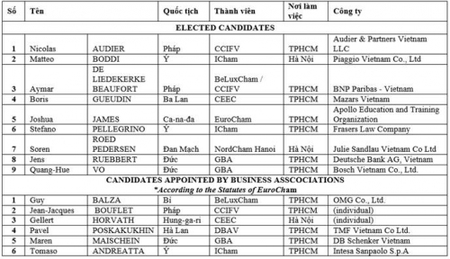 Thông qua kết quả bỏ phiếu, Ban điều hành 2017 của EuroCham đã được bầu chọn, bao gồm 9 thành viên được bầu và 6 đại diện do Hiệp hội đối tác đề cử: