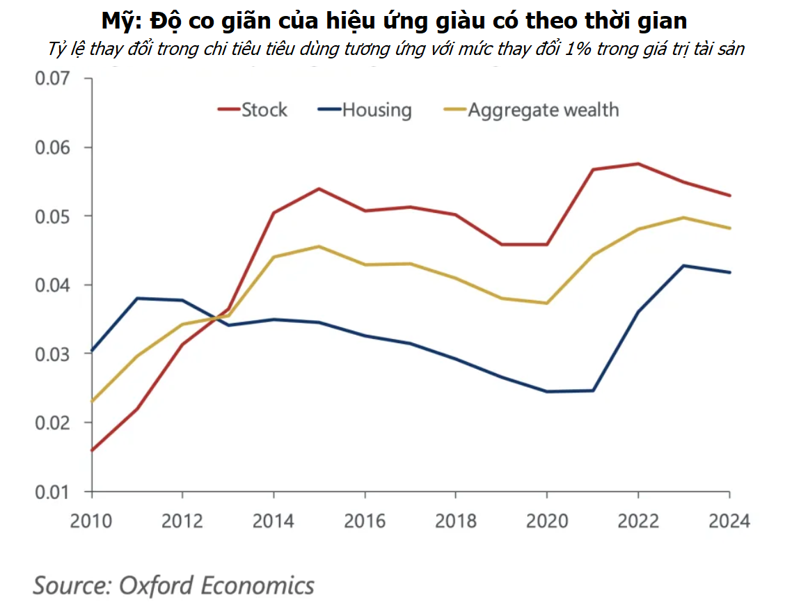 Nguyên nhân là do giá tài sản tăng đã thúc đẩy người tiêu dùng chi tiêu mạnh tay hơn, trong khi tiêu dùng đóng góp tới 70% GDP Mỹ. Hiệu ứng nhờ sự giàu có này đã trở nên mạnh mẽ hơn đáng kể trong 15 năm qua.