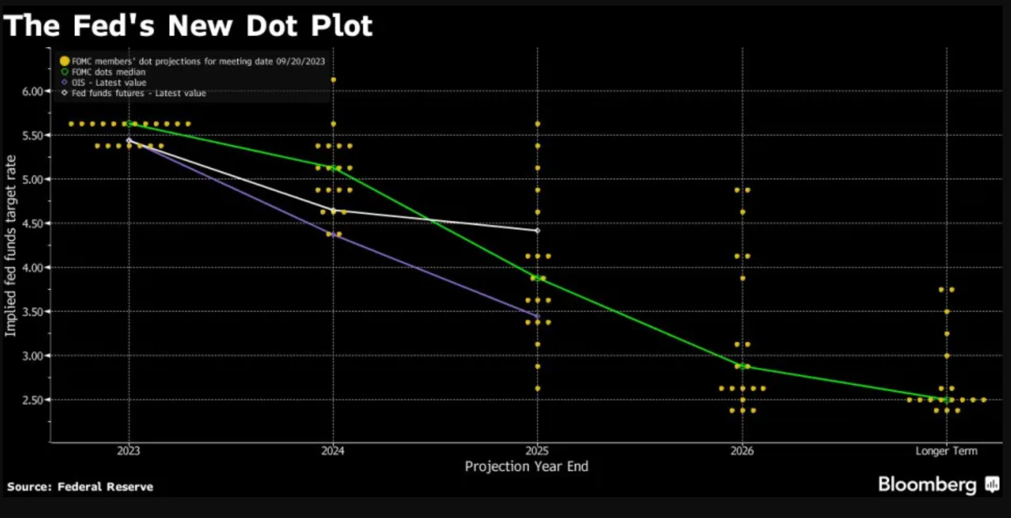 “Mặc dù biểu đồ dot plot cho thấy có khả năng còn một đợt tăng lãi suất khác trong năm nay, nhưng chúng tôi nhận thấy một số cú sốc tiềm ẩn đối với tăng trưởng từ nay đến cuối năm có thể làm hỏng kế hoạch đó. Sự bất ổn về kinh tế và sự gián đoạn từ các cuộc đình công của Nghiệp đoàn Công nhân ô tô Mỹ (United Auto Workers) và việc chính phủ sắp đóng cửa... có thể khiến Fed phải hoãn việc tăng lãi suất đến năm 2024, hoặc thậm chí hủy bỏ hoàn toàn”, chuyên gia kinh tế của Bloomberg, Anna Wong nhận định.