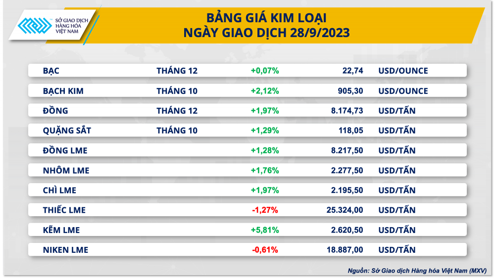 Khép lại ngày giao dịch 28/9, sắc xanh đỏ đan xen trên bảng giá thị trường kim loại. Trong nhóm kim loại quý, giá vàng nối dài đà giảm sang phiên thứ tư liên tiếp khi giảm 0,54%, đóng cửa tại mức 1.864,56 USD/oz, trong khi giá bạc và giá bạch kim đồng loạt phục hồi trong sắc xanh. Cụ thể,giá bạc nhích nhẹ 0,07% lên 22,74 USD/oz và giá bạch kim đóng cửa tại 905,3 USD/oz sau khi tăng 2,12%, xóa bỏ hoàn mức giảm của hai phiên trước đó.