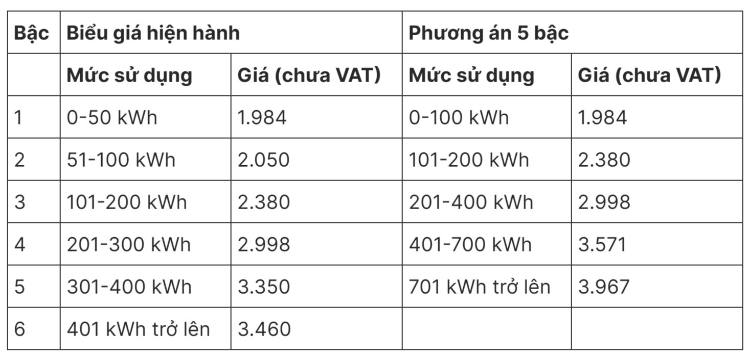 Theo đó, biểu giá điện bậc thang rút từ 6 xuống còn 5 bậc. Bậc rẻ nhất tính cho hộ gia đình dùng dưới 100 kWh thay vì 50 kWh hiện nay, còn bậc cao nhất từ 701 kWh trở lên.