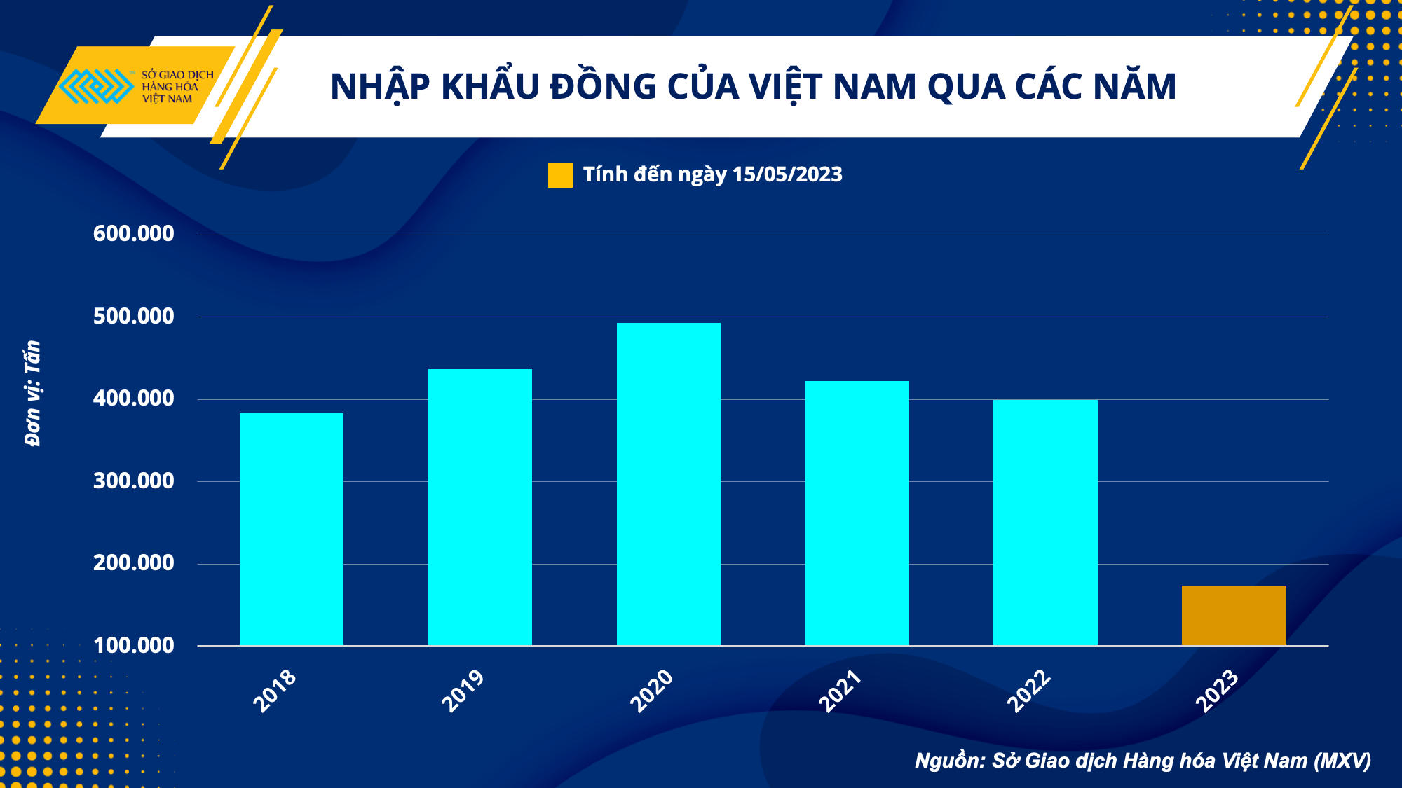 Theo số liệu của Tổng cục Hải quan, nước ta nhập khẩu 399.048 tấn đồng trong năm 2022, và ước tính sơ bộ tới ngày 15/5/2023, nước ta đã nhập khẩu 173.693 tấn đồng, tăng 22% so với cùng kỳ năm trước.