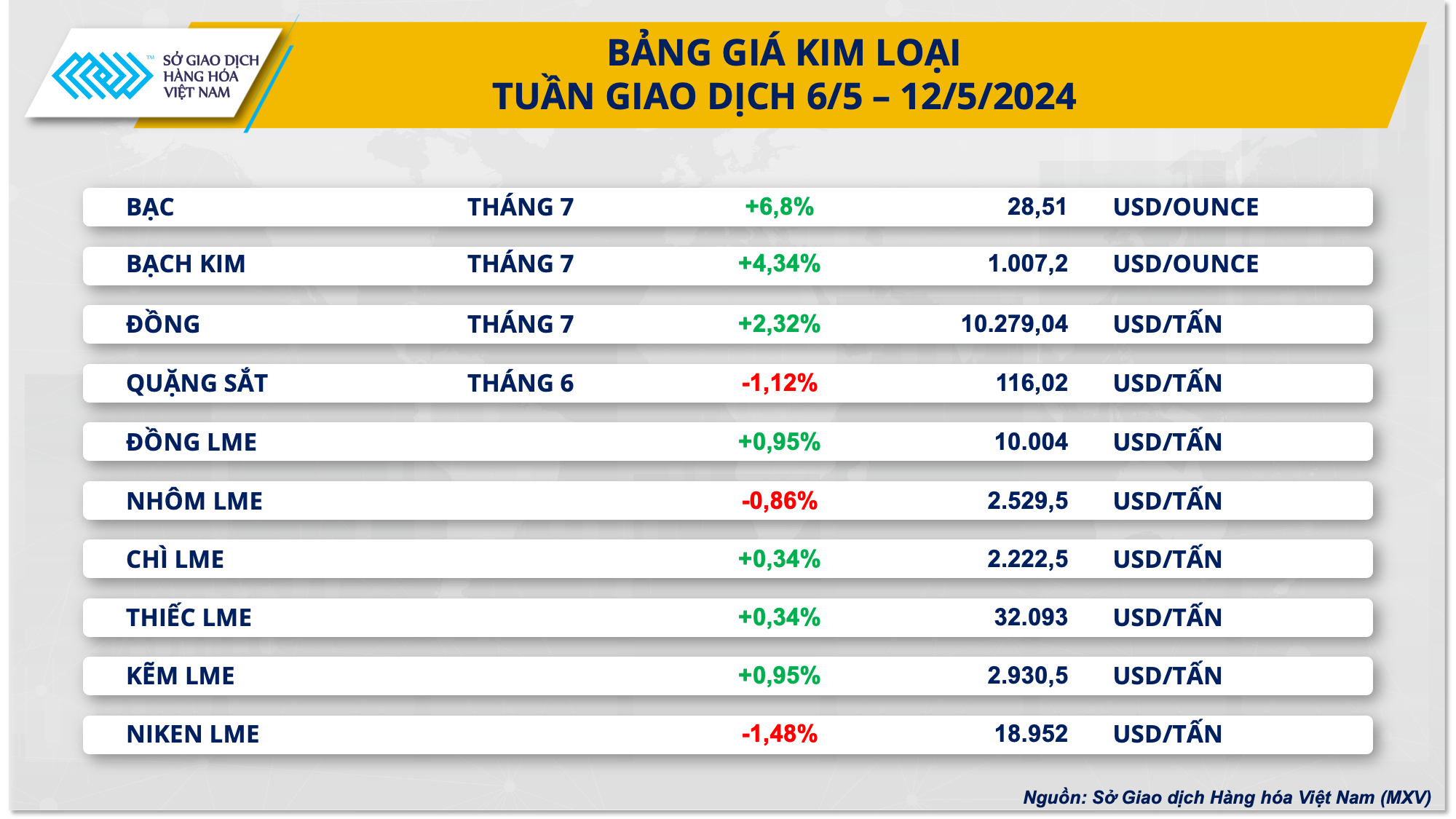 Kết thúc tuần giao dịch 6-10/5, hầu hết các mặt hàng nhóm kim loại đồng loạt tăng giá nhờ hỗ trợ kép từ yếu tố vĩ mô kết hợp với cung - cầu. Đối với kim loại quý, giá bạc và giá bạch kim tăng mạnh sau loạt dữ liệu cho thấy sự suy yếu của nền kinh tế Mỹ, củng cố cho kỳ vọng hạ lãi suất.