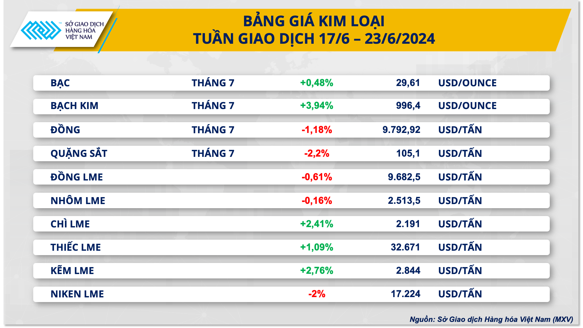 Đối với kim loại cơ bản, giá quặng sắt giảm mạnh nhất nhóm khi giảm 2,2% xuống 105,1 USD/tấn, đánh dấu tuần giảm giá thứ tư liên tiếp. Giá quặng sắt tiếp tục gặp sức ép khi thị trường ngày càng tỏ ra lo ngại về nhu cầu suy yếu tại Trung Quốc, quốc gia tiêu thụ sắt thép lớn nhất thế giới. Dữ liệu đã chỉ ra tồn kho quặng sắt tại các cảng lớn của Trung Quốc đã tăng vượt 147 triệu tấn, tăng khoảng 27% so với đầu năm nay và là mức cao nhất trong vòng hơn 2 năm trở lại đây.