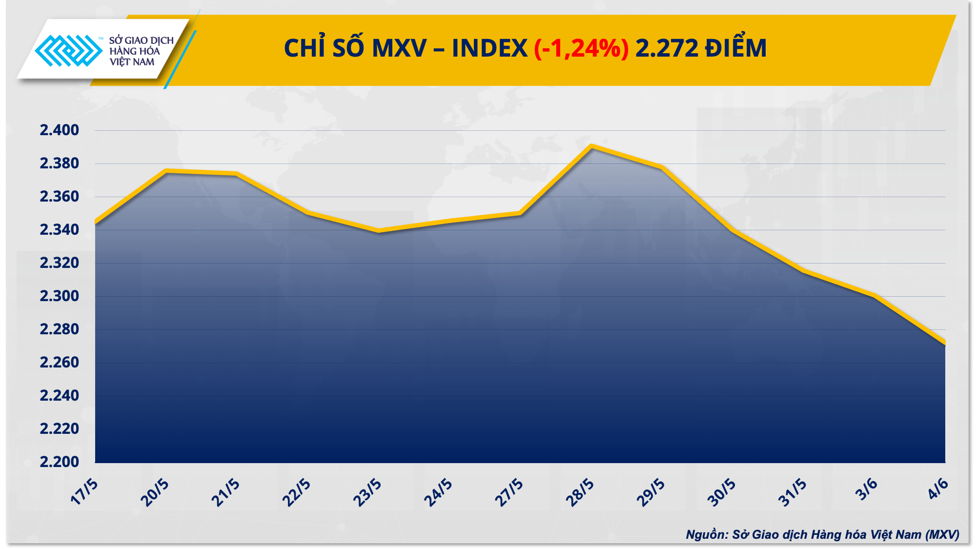 Chỉ số MXV-Index đóng cửa giảm 1,24% xuống 2.272 điểm, mở rộng đà giảm sang ngày thứ 5 liên tiếp, đồng thời về mức thấp nhất trong 1 tháng trở lại đây, phản ánh xu hướng suy yếu của giá hàng hóa.