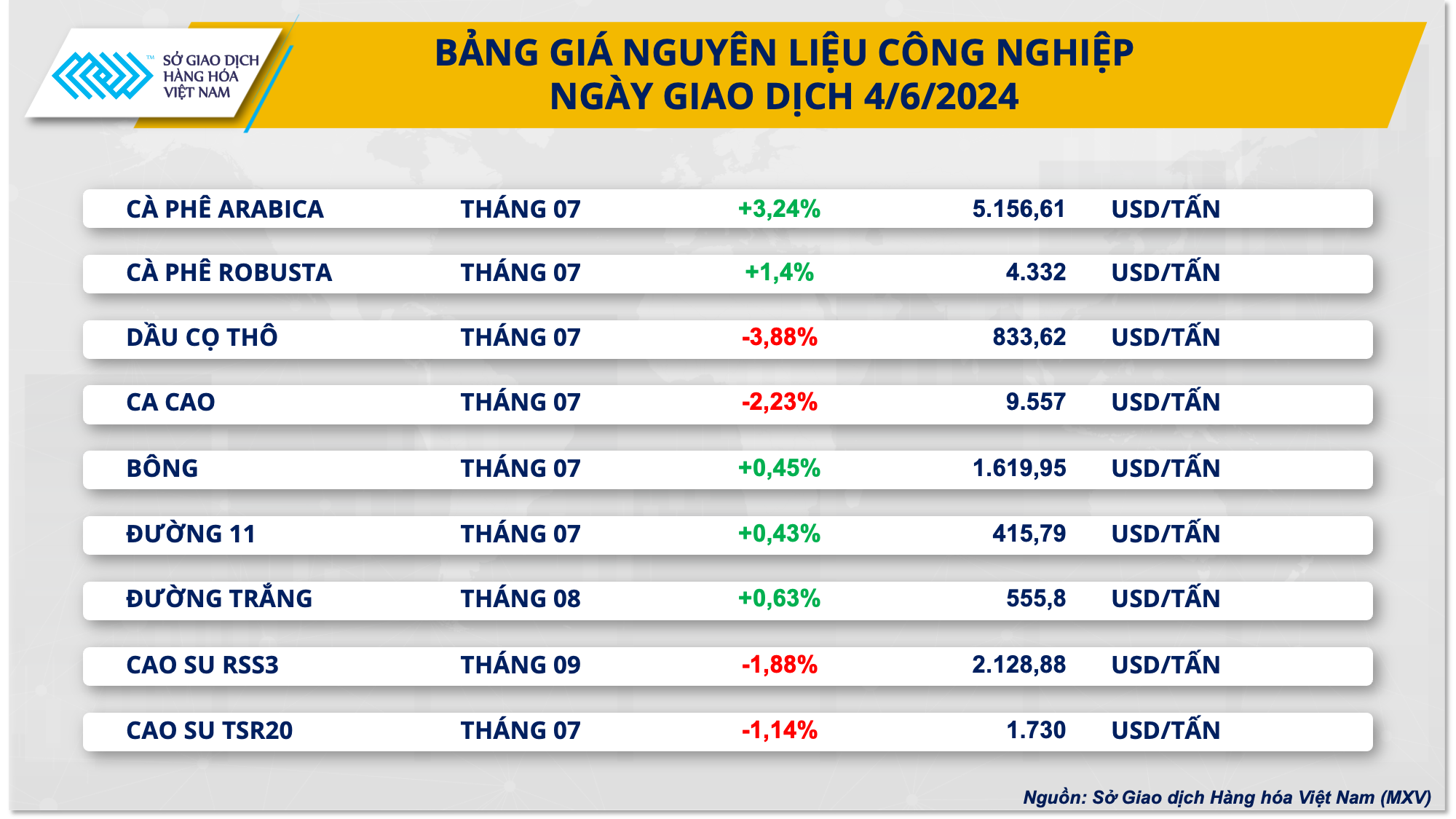 Nhóm cà phê là điểm sáng của thị trường khi là mặt hàng hiếm hoi duy trì đà tăng ổn định. Chốt ngày, giá Arabica tăng 3,2%, cà phê Robusta tăng 1,4%, chạm mức cao nhất trong vòng 4 tuần.