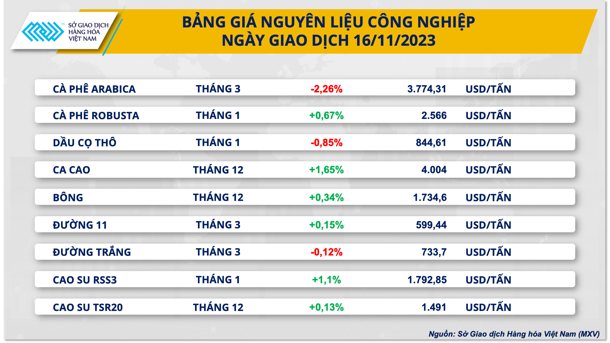 Trong một diễn biến đáng chú ý khác, giá hai mặt hàng cà phê diễn biến trái chiều. Cụ thể, giá Robusta tiếp tục tăng, đóng cửa cao hơn mức tham chiếu 0,67%. Trong khi đó, giá Arabica quay đầu giảm 2,26%. Lượng cà phê chờ phân loại tăng lên trên Sở ICE-US phần nào tạo áp lực lên giá Arabica. Ngược lại, thị trường xuất hiện thông tin mưa làm chậm quá trình thu hoạch cà phê tại Việt Nam, từ đó thúc đẩy lực mua đối với Robusta.