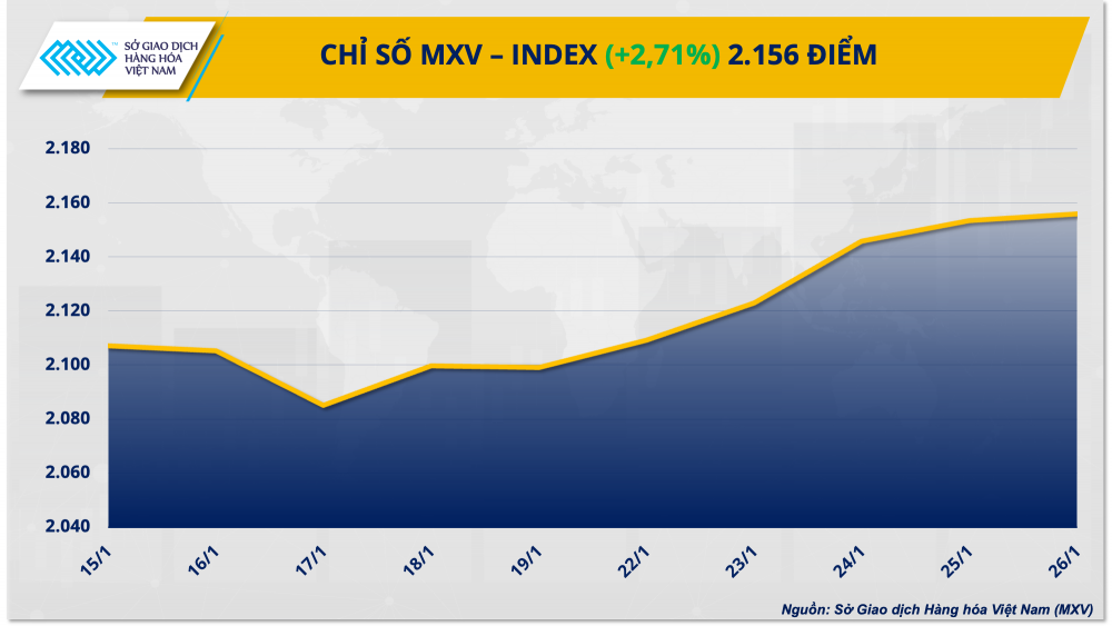 Chốt tuần, chỉ số MXV-Index của 3/4 nhóm mặt hàng ngập sắc xanh kéo chỉ số MXV-Index tăng 2,71% lên 2.156 điểm. Giá trị giao dịch trung bình toàn Sở ở mức gần 4.900 tỷ đồng mỗi ngày.