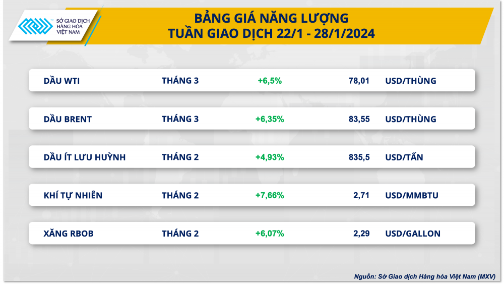 Theo MXV, kết thúc tuần giao dịch 22 - 28/1, toàn bộ 5 mặt hàng trong nhóm năng lượng đều tăng giá mạnh. Trong đó, giá dầu WTI tăng 6,5% lên 78 USD/thùng, ghi nhận mức cao nhất trong hai tháng qua. Dầu Brent chốt tuần với mức giá 83,55 USD/thùng, cao hơn 6,35% so với tuần trước đó.