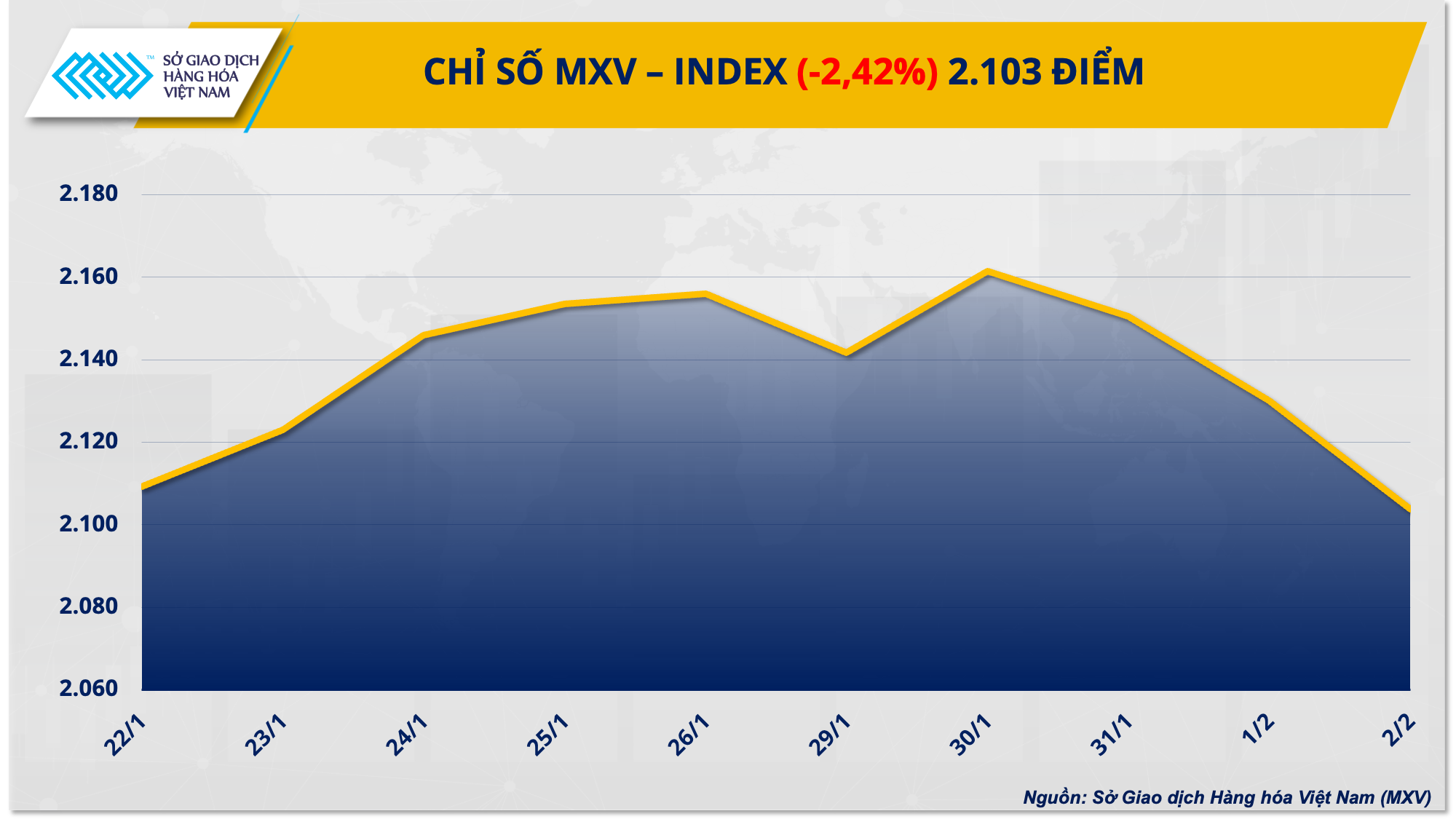 Kết thúc tuần, có 25 trên tổng số 31 mặt hàng đang được giao dịch liên thông thế giới tại MXV đồng loạt giảm giá, kéo chỉ số MXV-Index suy yếu 2,42% xuống 2.103 điểm, nối dài đà giảm sang phiên thứ 3 liên tiếp. Tuy nhiên, nhờ ưu điểm giao dịch hai chiều, giá trị giao dịch trung bình toàn Sở tuần qua vẫn đạt hơn 7.500 tỷ đồng mỗi ngày, trong đó, kết tuần giá trị lên mức cao kỷ.