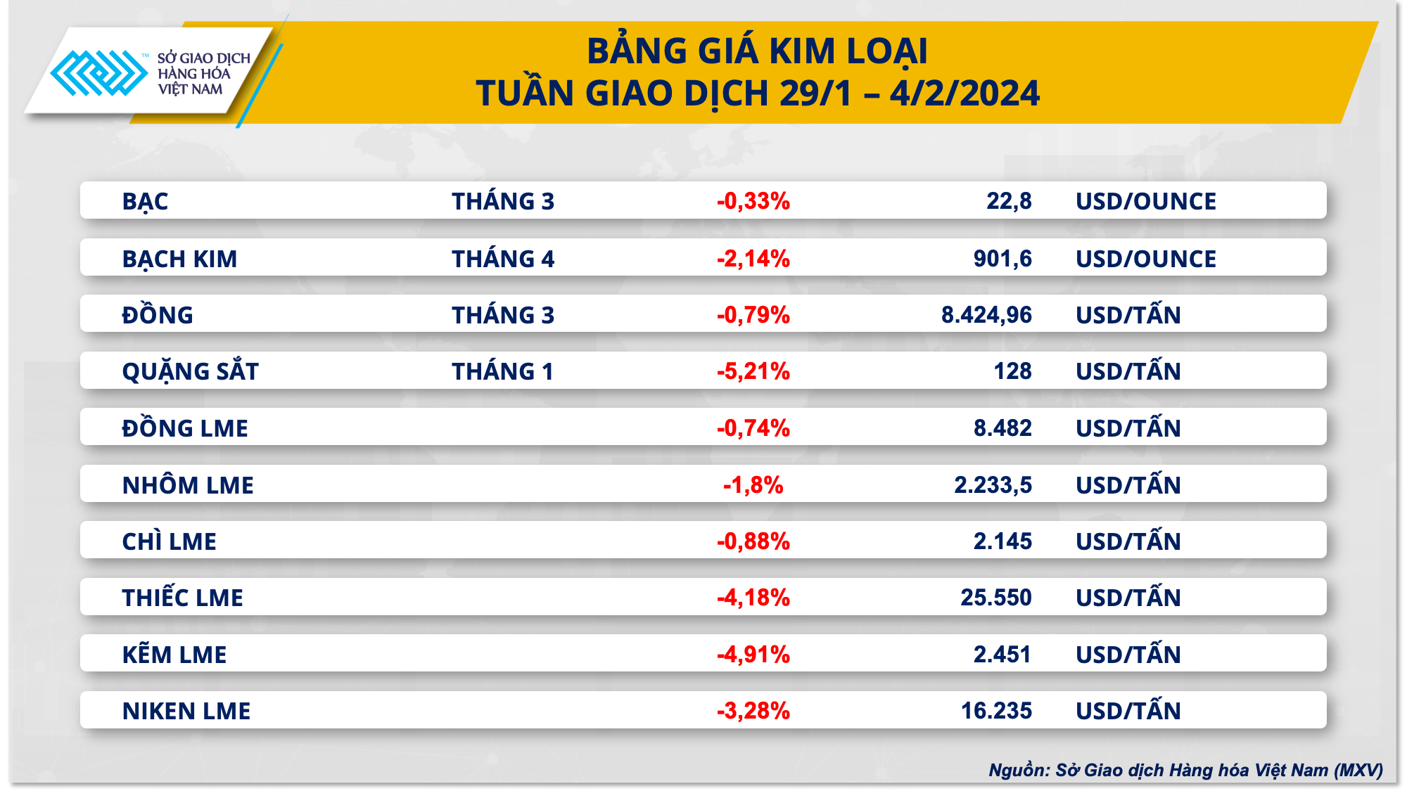 Kết thúc tuần giao dịch 29/1-4/2, áp lực vĩ mô tăng cao đã đẩy giá các mặt hàng kim loại đồng loạt giảm. Đối với kim loại quý, giá bạc chốt tuần tại mức 22,79 USD/oz sau khi để mất 0,33%. Giá bạch kim giảm 2,14% về 901,6 USD/oz, mức thấp nhất trong gần ba tháng qua.