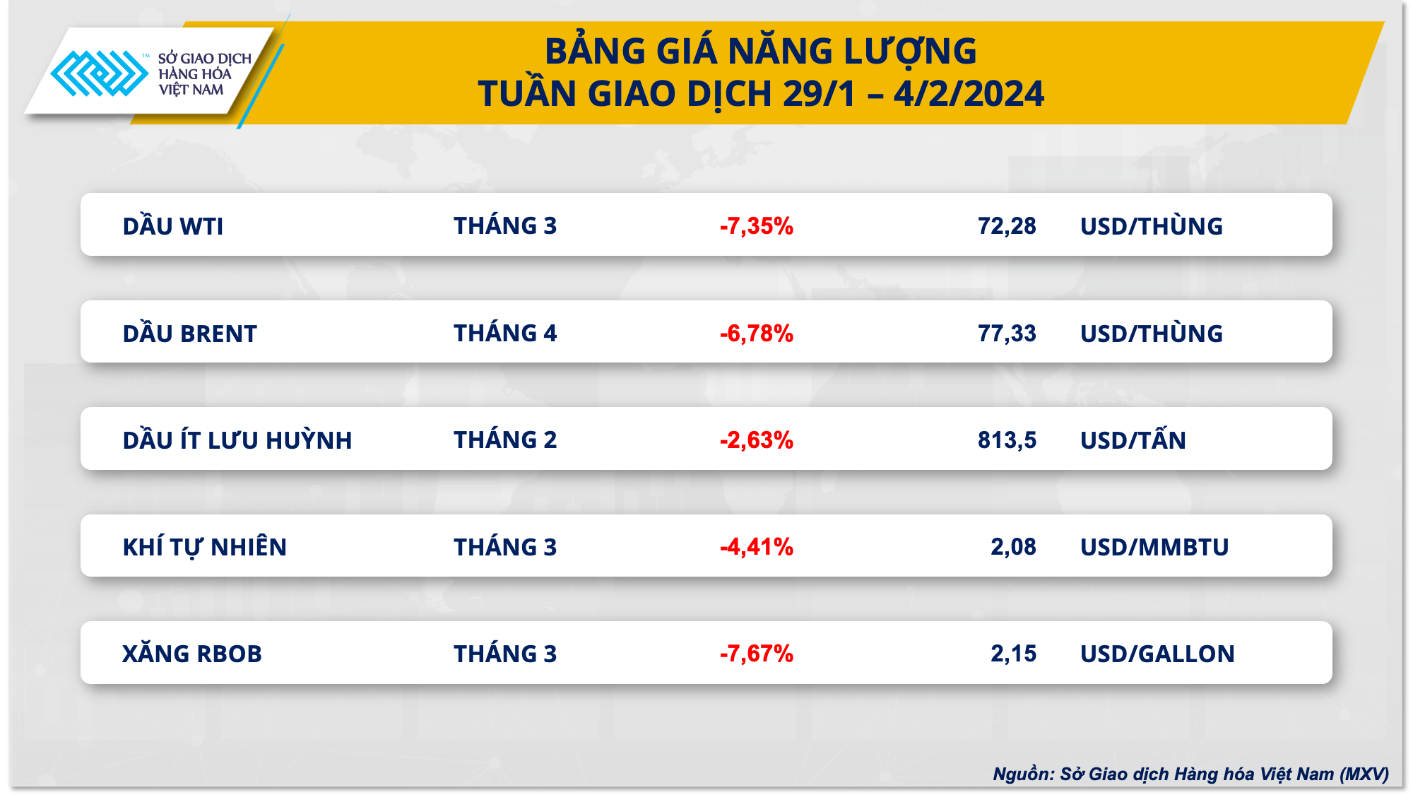Theo MXV, lực bán mạnh trên thị trường dầu thô đã kéo giá dầu có mức giảm theo tuần mạnh nhất trong vòng 4 tháng qua. Trong tuần giao dịch ngày 29/1-4/2, áp lực từ cả hai phía cung cầu cùng những thông tin xoay quanh xung đột tại khu vực Trung Đông khiến giá rung lắc mạnh. Chốt tuần, giá dầu WTI giảm 7,35% xuống 72,28 USD/thùng. Dầu Brent giảm 6,78% xuống 77,33 USD/thùng. Cả hai loại đều đạt mức thấp nhất kể từ giữa tháng 1.