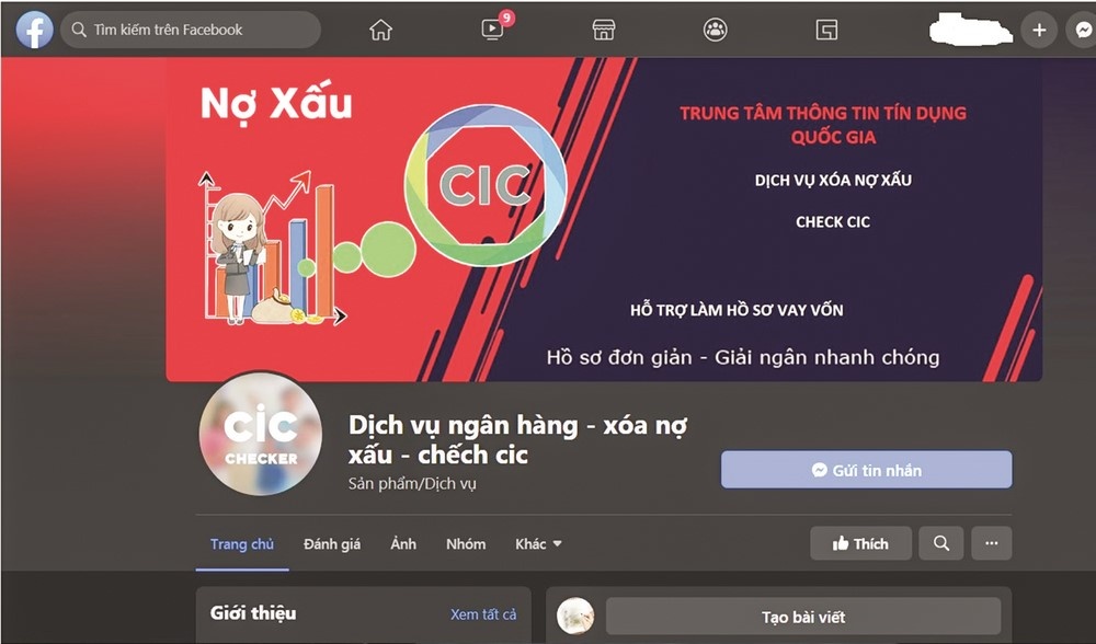 Tương tự, trên trang facebook/Dịch vụ ngân hàng - xóa nợ xấu - check cic… các đối tượng cũng sử dụng hình ảnh cán bộ, lãnh đạo CIC, đồng thời quảng bá dịch vụ kiểm tra – xóa nợ xấu nhanh chóng. Trang này nhận xóa tất cả các nhóm nợ xấu bao gồm nợ đã thanh toán hết với các ngân hàng và hiện vẫn còn dư nợ tại các ngân hàng…