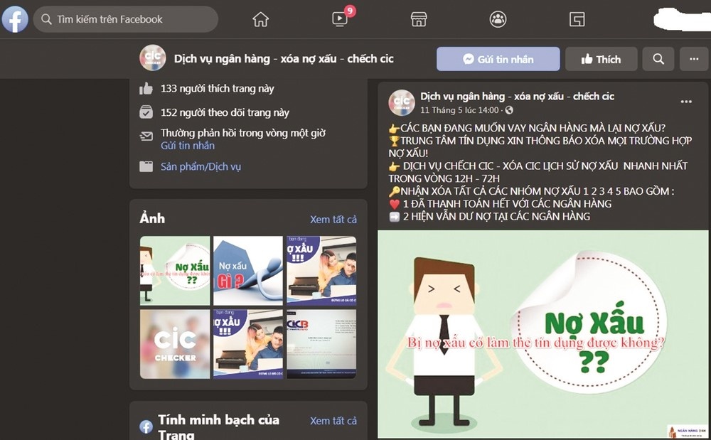 Trong vai một khách hàng có nhu cầu vay vốn của ngân hàng nhưng đang có nợ xấu nhóm 5 tại một NHTMCP, phóng viên Thời báo Ngân hàng đã liên hệ với trang facebook “nhận check nợ CIC……” để nhờ xóa nợ xấu này tại CIC. Sau vài lời giới thiệu, admin trang này ra giá 3,5 triệu đồng để xóa hoàn toàn nợ xấu trên CIC trong 24h, và yêu cầu chuyển khoản đặt cọc trước 1,5 triệu đồng vào tài khoản mới thực hiện việc xóa nợ xấu trên CIC. Khi phóng viên yêu cầu gặp mặt để trao đổi trực tiếp thì các đối tượng này nêu lý do “bận”, “việc nhỏ, không cần gặp”… đồng thời trưng ra các ảnh của lãnh đạo CIC đã đăng trên các báo để chứng minh có quan hệ với tổ chức này.