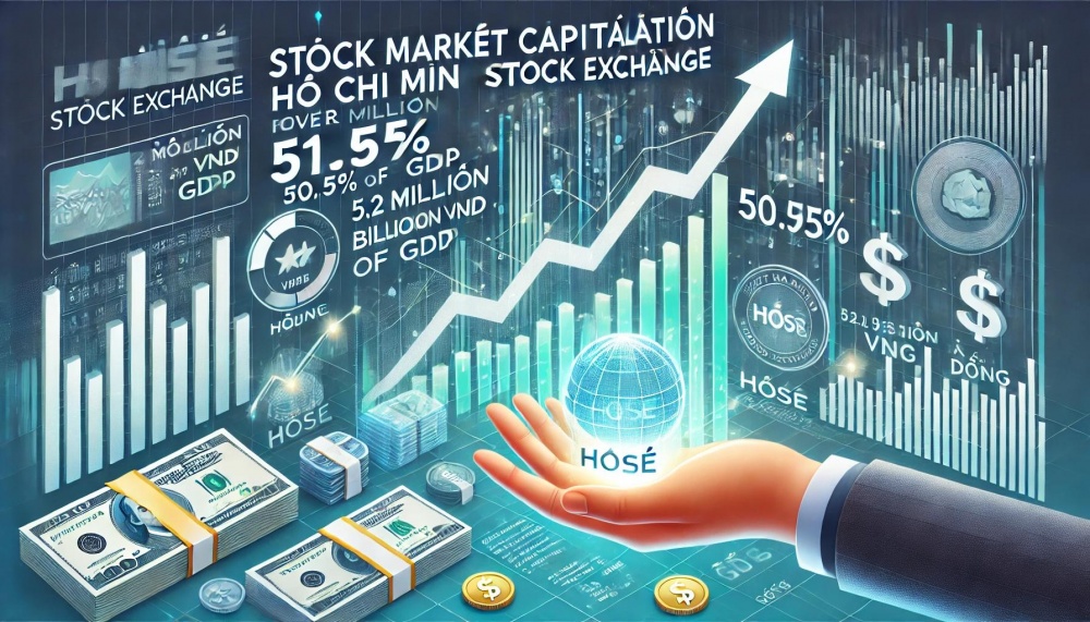 Giá trị vốn hóa cổ phiếu trên HoSE đạt hơn 5,2 triệu tỷ đồng, tương đương 50,95% GDP