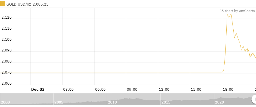 Tính đến 9h sáng nay (4/12) theo, giờ Việt Nam, giá vàng giao ngay tăng 13,9 USD/oz (+0,67%) so với mở cửa, hiện ở mức 2.084,9 USD/oz, giao dịch đang dao động trong khoảng 2.047,4 - 2.071USD/oz.