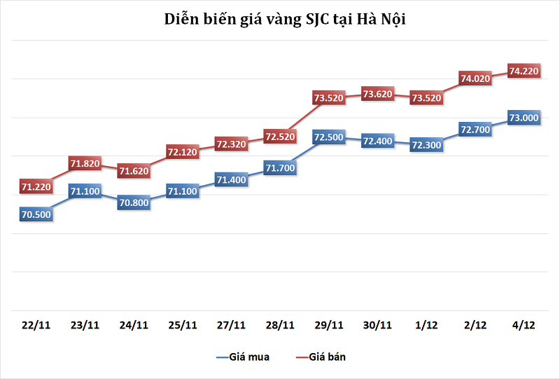 Tại Hà Nội, giá vàng SJC được niêm yết ở mức 73,00 - 74,22 triệu đồng/lượng, tăng 300 nghìn đồng/lượng ở chiều mua vào và tăng 200 nghìn đồng/lượng ở giá bán ra so với cuối phiên trước.