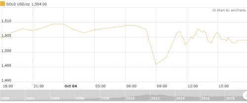 Theo khảo sát của thoibaonganhang.vn, tính đến 10h sáng nay 5/10 (theo giờ Việt Nam), giá vàng thế giới giao ngay đứng ở mức 1.504 USD/oz, giảm 0,8 USD/oz (0,05%) so với cùng thời điểm. Giao dịch trong phiên dao động quanh ngưỡng 1.495,2 - 1.515 USD/oz.