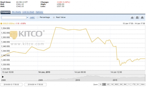 Theo khảo sát của thoibaonganhang.vn, đến 10h sáng nay (15/6) theo giờ Việt Nam, giá vàng thế giới giao ngay đứng ở mức 1.341,1 USD/oz, giảm 0,8 USD/oz (-0,06%) so với cuối phiên trước. Giao dịch trong phiên dao động quanh ngưỡng 1.337,3 - 1.359 USD/oz.