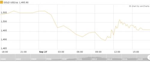Theo khảo sát của thoibaonganhang.vn, tính đến 10h sáng nay 28/9 (theo giờ Việt Nam), giá vàng thế giới giao ngay đứng ở mức 1.495,9 USD/oz, giảm 8,4 USD/oz (0,56%) so với cùng thời điểm. Giao dịch trong phiên dao động quanh ngưỡng 1.485,9 - 1.507,6 USD/oz.