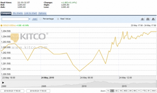 Theo khảo sát của thoibaonganhang.vn, đến 10h sáng nay (25/5) theo giờ Việt Nam, giá vàng thế giới giao ngay đứng ở mức 1.284,6 USD/oz, tăng 1,8 USD/oz (0,14%) so với cuối phiên trước. Giao dịch trong phiên dao động quanh ngưỡng 1.280,4 - 1.285,8 USD/oz.