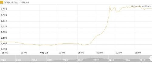 Theo khảo sát của thoibaonganhang.vn, tính đến 9h sáng nay 24/8 (theo giờ Việt Nam), giá vàng thế giới giao ngay đứng ở mức 1.526,6 USD/oz, tăng 29,1 USD/oz (1,94%) so với cùng thời điểm. Giao dịch trong phiên dao động quanh ngưỡng 1.493 - 1.530,9 USD/oz.